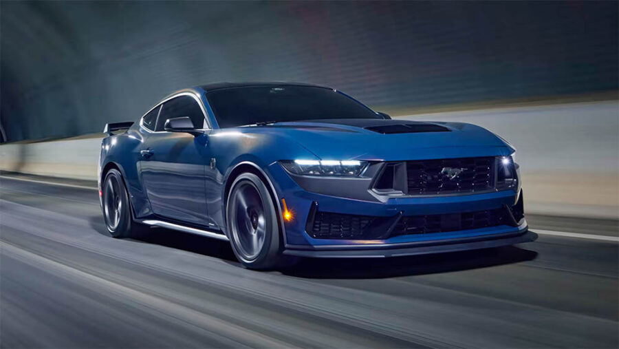 De Ford Mustang Dark Horse. Dorpelbekleding aan de zijkant. Vaste achtervleugel. Sportieve diffuser en zwarte viervoudige uitlaatpijpen. Verduisterde ledkoplampen. Unieke glanzend zwarte grille en gelakte motorkapopeningen. Design krijgt een nieuwe dimensie.